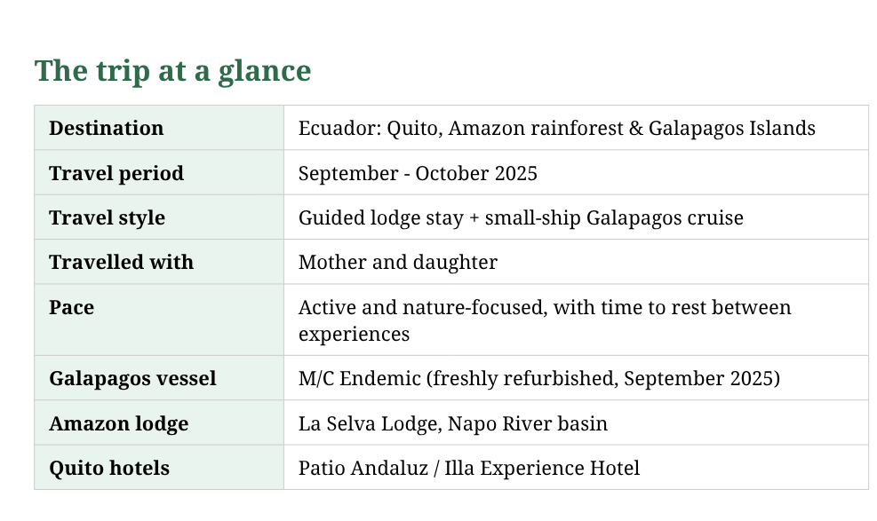 Beke Grossmann has been recommending Ecuador to her Viva Expeditions clients for years. In September 2025, she finally visited, taking her mum along for a 14-day trip to see if the country really delivers everything she'd been promising. The itinerary started with a few days in the vibrant capital city of Quito, to soak up the grand colonial architecture and the exquisite cuisine. Then they ventured deep in the Amazon rainforest, staying at the remote La Selva Lodge. The grand finale? A stunning cruise around the Galapagos Islands aboard the M/C Endemic.