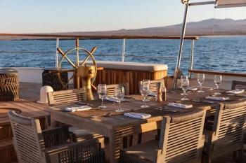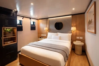 Each cabin is equipped with private facilities, air-conditioning and a window or a port hole. Common areas are spacious and various from a lounge with a bar and a TV, a library to a sun deck with a jacuzzi. Passengers can interact with a naturalist guide onboard. All meals are served buffet style and can be taken in either the inside dining room or the al-fresco dining area.
